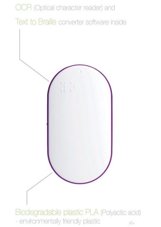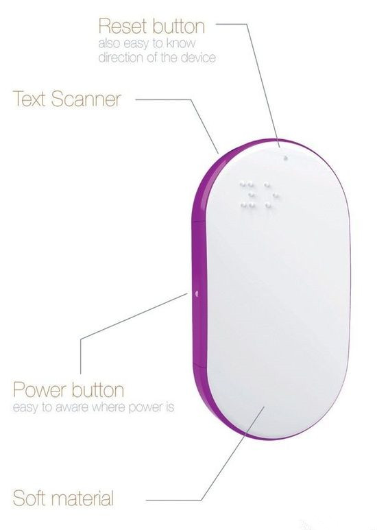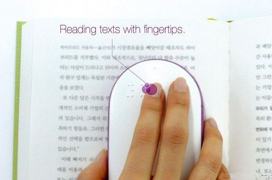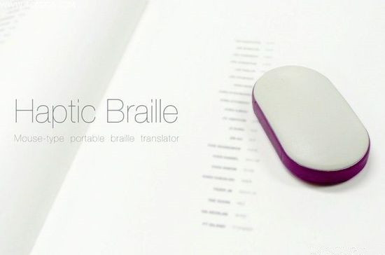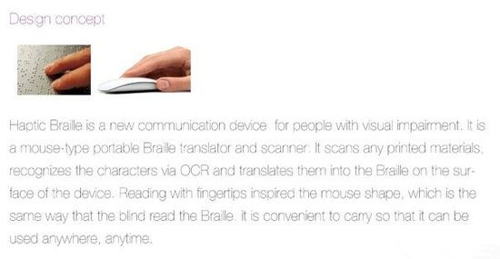 鼠標可不是用來操控電腦的,它只是用了鼠標的形狀方便人手把握,在鼠標底部有個掃描模塊,可以跟隨鼠標移動掃描文字,再通過內部結構,最終將文字翻譯成盲文凸點顯示,這樣盲人就可以通過盲點來閱讀了,省去了翻譯書籍的步驟,擴大盲人們的閱讀面,整體采用柔軟材質,開關和控制鍵有浮點標示。